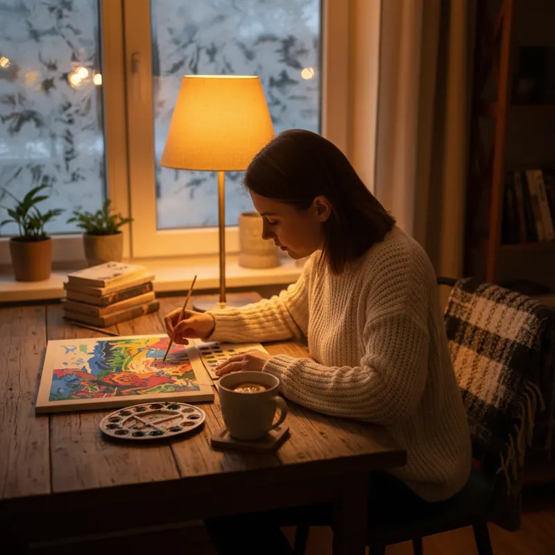 Человек наслаждается рисованием по номерам за уютным столом в тёплой польской квартире зимним вечером