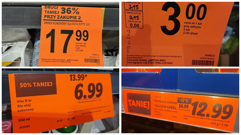 Президент UOKiK (Польское управление по вопросам конкуренции и защиты прав потребителей) предъявил обвинения компании Jeronimo Martins Polska, управляющей сетью Biedronka. Речь идёт о неясном способе информирования о промоакциях — от «1+1 gratis» до «−50% при покупке 2», — когда на ценнике крупнее всего выделяли «красивую» цену за единицу, действующую только при покупке нескольких штук. Самая низкая цена за 30 дней до скидки, которую требует показывать Директива Omnibus, часто была спрятана «мелким шрифтом» внизу.